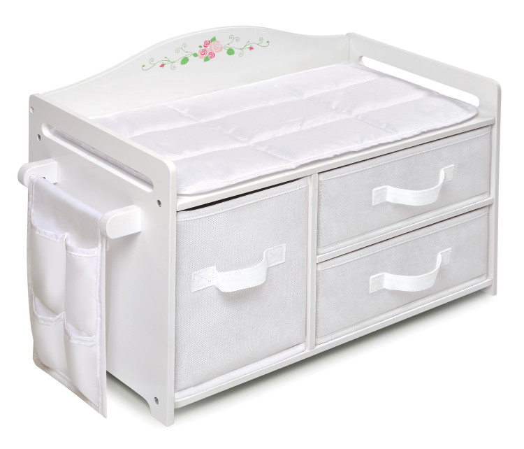 Badger Basket’s White Rose Doll Care Station offers one place for storing and organizing your doll’s things, changing her, and then putting her to bed! The silk-screened rose and leaf design is bursting with pretty pinks and spring green to complement the solid white finish. Personalize with pretty shapes and your child’s name (or favorite doll’s name) using the free, self-adhesive decals included! Fill up the three removable baskets with all of your baby doll’s stuff. One large and two small baskets accommodate all sorts of doll clothes and accessories. The baskets are fully removable and can be used separately. Baskets also can fold flat for storage by simply removing the bottom panel and folding the basket body. Grab the basket handles to quickly open the drawers and check your supplies. Never lose those small items! The pocket organizer on the side has four equal pockets to keep little things at hand like a bottle, hairbrush, or pacifier. Organizer secures with hook-and-loop tape, and can be removed if you want to use the side bar for hanging clothes or towels. Your dolly won’t mind lying down on the soft, quilted, and padded mat on top to have her clothes or diaper changed, or to go nighty night. Open back design so the baskets are accessible from either side. Can also be used as a vet station when examining and caring for your stuffed pets! Designed for dolls up to 20 inches. Fits 18 inch dolls such as American Girl, My Life As, Madame Alexander, Ashton Drake, and Our Generation; and also fits 15 inch American Girl Bitty Baby dolls and 14.5 inch American Girl WellieWishers dolls. Care Station is made with durable engineered wood with a white, painted finish. Alphabet/shape decals made with laminated, waterproof PVC. Fabric is 100% polyester fabric with 100% polyester fill. Baskets are made with non-woven fabric and internal cardboard support panels. Overall assembled dimensions: 23.5 inches L x 11.5 inches W x 14.75 inches H. Width not including side bar: 21-5/8 inches W. Floor to top surface: 10.75 inches H. Floor to top of side panel: 13 inches H. Floor to top of side bar: 9.5 inches H. Top surface to top middle of back panel: 4 inches H. Top surface to top of side panel: 2 inches H. Interior of bed/changing area: 20.75 inches L x 11 inches W. Width of Bar (where pocket organizer attaches): 6.25 inches W. Width of Side Bar including supports: 7.5 inches W. Padded Fabric Mat: 20.5 inches L x 10.5 inches W. Fabric Organizer: 6.5 inches W x 9.5 inches H (pockets 3.5 inches W x 3 inches H). Large Basket: 7.5 inches L x 11 inches W x 9 inches H. Large Basket Opening: 7.75 inches W x 11.5 inches D x 9.25 inches H. Small Baskets each: 12.5 inches L x 11 inches W x 4 inches H. Small Basket Opening: 12.5 inches L x 11.5 inches W x 4.5 inches H. Assembled weight: 12.5 pounds. All measurements approximate. Frame can be wiped clean with a damp cloth and mild soap and dry thoroughly. Spot clean fabric and baskets as needed with cold water and mild detergent and allow to air dry. Never immerse the baskets in water due to the internal cardboard support panels. Do not use chemical cleaners on the peel-and-stick decals. Adult assembly required. Illustrated instructions included for care station assembly and application of the decals. For children from three years old and up. This item is to be used with dolls only and is never to be used with real infants or pets. /! WARNING: CHOKING HAZARD – Small parts. Not for children under 3 yrs. Product complies with all currently applicable safety standards. Product includes a limited warranty of 30 Days Parts to the original purchaser. Doll and doll clothes/accessories not included. Product may vary slightly from shown and described. Props/accessories shown are for illustration purposes only and are not included with the product. Actual color/finish may vary slightly from screen display. This item ships in its original carton which may include a product photo.