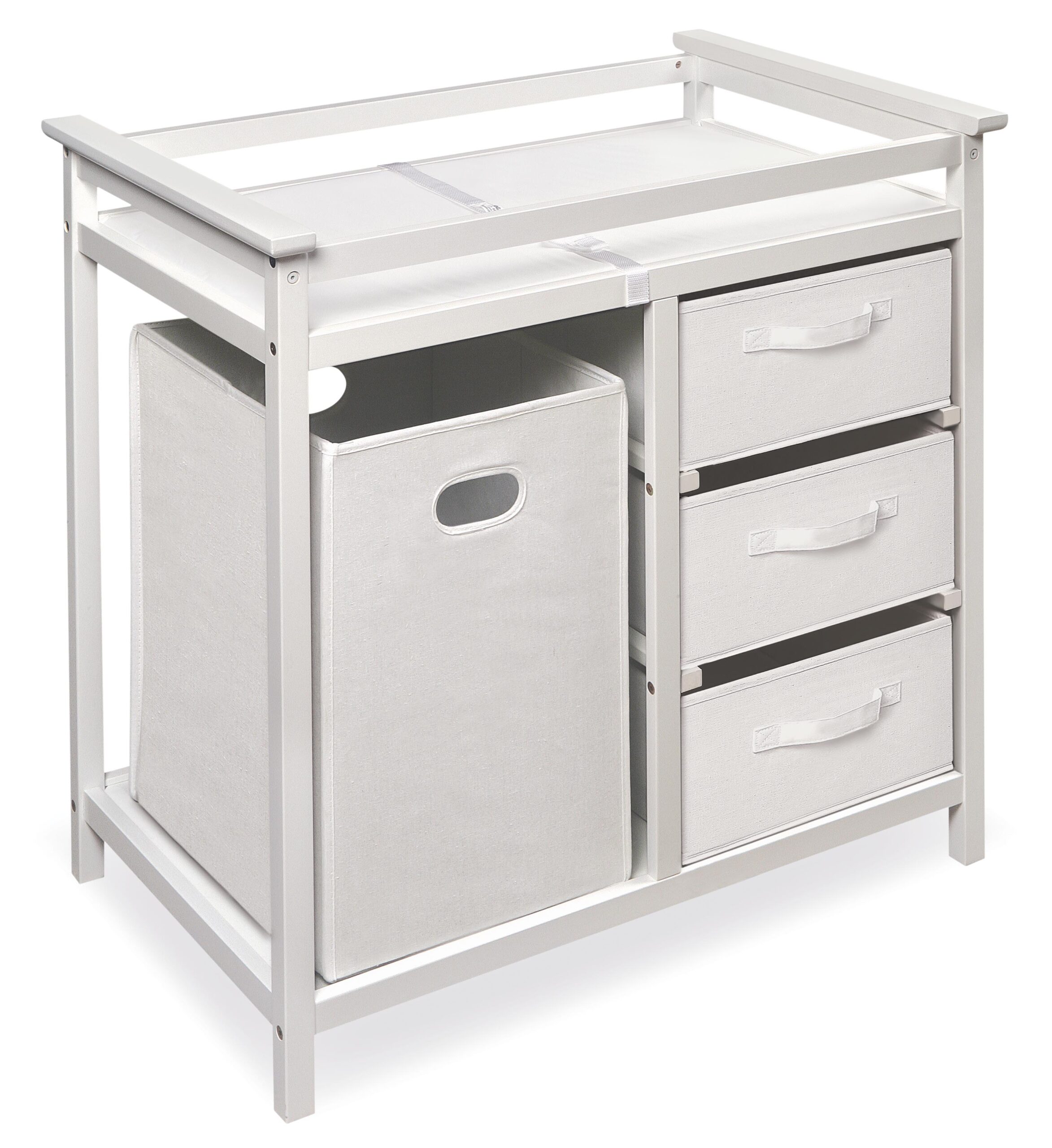 Badger Basket’s Modern Baby Changing Table with Hamper and Three Baskets is a practical and stylish place for diaper changing and getting baby ready for the day or night. Sophisticated, angular design for any smart, classy nursery. The large hamper contains and conceals dirty duds, or use it to store blankets and toys or bulk packs of diapers and wipes. The hamper has handle slots and easily removes from its shelf to carry to your laundry room. Alternatively, use the hamper elsewhere in the nursery or your house, leaving you a convenient spot in the changing table for your diaper pail or open storage. Three baskets are ideal for changing supplies, linens, baby blankets, lotions, and toiletries. Front handles on the baskets make them easy to open one handed. Baskets slide open smoothly and are fully removable so you can effortlessly access all the space inside. Take the baskets anywhere in the house to fill or empty them. Includes a changing pad and safety belt, too. When Baby outgrows this table, it becomes a useful and attractive piece of furniture for organizing toys, stuffed animals, games, puzzles, hats, mittens, blankets, and craft supplies. Safety rails enclose all four sides around the top of the table. Metal support bar beneath the changing surface provides additional stability. Hamper and baskets fold for storage. Just remove the bottom panel and fold flat. Changing Table frame made with multi-layer solid wood, and the shelves are engineered wood with veneer. All paints and finishes are non-toxic. Outside fabric on the baskets is 80% Polyester/20% Cotton. Inside lining on the baskets (including the bottom panel) is non-woven fabric. Changing pad is polyurethane foam covered with wipe clean PEVA (non-PVC) vinyl. Overall unit measures 34.25 inches W x 20.75 inches D x 34.5 inches H. Hamper measures 13.5 inches L x 13.75 inches D x 21.5 inches H. Hamper area of the changing table measures 15 inches W x 18.75 inches D x 24.5 inches H. Baskets measure 14.25 inches L x 17 inches W x 7 inches H. Height from top platform to top of end panels is 5 inches H. Height from top platform to the top side rails is 4 inches. Height clearance from the floor is 3 inches. Changing pad measures 31.5 inches L x 17.5 inches W x 1 inch H. Assembled weight: 32 lbs. All measurements approximate. Wipe the table and changing pad clean with a damp cloth and mild soap as needed and dry thoroughly. Spot clean hamper and baskets as needed. Never immerse the hamper and baskets in water due to the internal cardboard support panels. Basket color depends on color of the table (baskets are either White or Ecru). Changing table is for use with children weighing up to 30 lbs. (13.6 kg). Adult assembly required. Illustrated assembly instructions included. Meets all currently applicable testing standards. Product includes a limited warranty of 30 Days Parts to the original purchaser. Product may vary slightly from shown and described. Props/accessories shown are for illustration purposes only and are not included with the product. Actual color/finish may vary slightly from screen display. This item ships in its original carton that may include a product photo.
