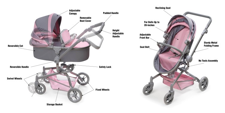 - Fancy toy pram has an enclosed bassinet for pretend newborns that converts to an open stroller seat with front bar and 3-point seat belt