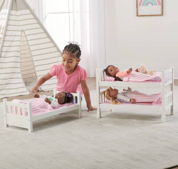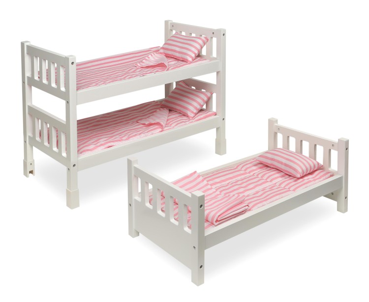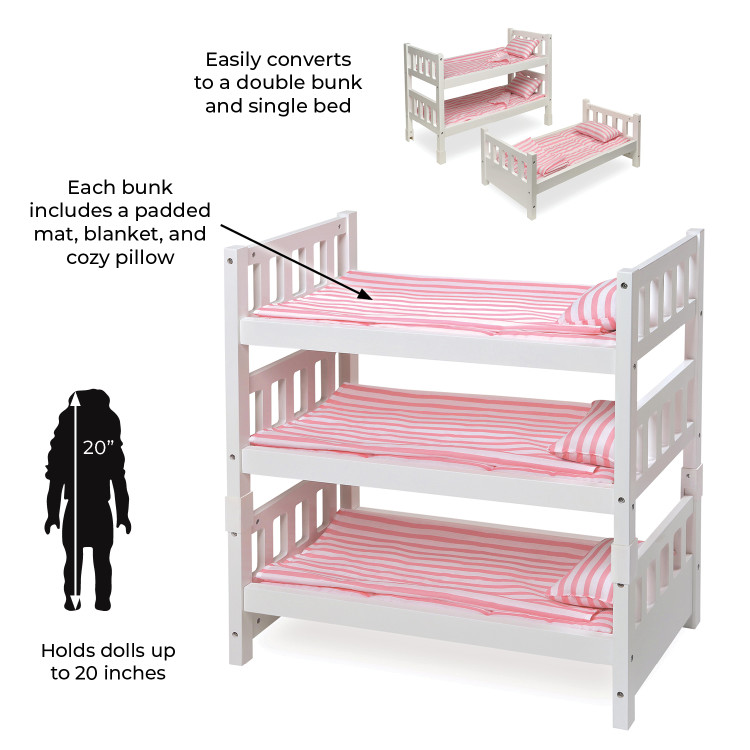 Badger Basket’s 1-2-3 Convertible Doll Bunk Bed with Bedding features two bed configurations for sleepover doll fun! Stack it as a triple doll bunk bed, or convert it to a double bunk and single bed. For sleepy time comfort, all three beds are outfitted with a bedding set made of cool and casual pink stripe fabric. Bedding set includes three fluffy padded mats, three single-layer blankets, and three stuffed pillows. Personalize with pretty shapes and your child’s name (or favorite doll’s name) using the free, self-adhesive decals included! This bunk bed is so fun, your stuffed animals will be begging to nap here, too! Fun for little mommies caring for their pretend, tired children. No tools needed to convert from triple bed to single and double bed. Designed for dolls up to 20 inches. Fits 18 inch dolls such as American Girl, My Life As, Madame Alexander, Ashton Drake, and Our Generation; and also fits 15 inch American Girl Bitty Baby dolls and 14.5 inch American Girl WellieWishers dolls. Doll Bunk Bed is made with durable engineered wood with a white, painted finish. Alphabet/shape decals made with laminated, waterproof PVC. Removable bedding is made with 100% Polyester fabric with 100% Polyester fill. Overall assembled dimensions (triple bed): 22.25 inches L x 12 inches W x 23.5 inches H. Overall dimensions (double bed): 22 inches L x 12 inches W x 15.75 inches H with 3.25 inch clearance off the floor. Double bed measuring from top bunk bed platform: 4.25 inches H to top center of end panel and 4.5 inches H to top of corner post. Overall dimensions (single bed): 22 inches L x 11.75 inches W x 8.5 inches H with 3 inch clearance off the floor. Single bed – from bed platform: 4.25 inches H to top center of end panel and 4.75 inches H to top of corner post. Clearance between bunks: 6.5 inches H between bottom and middle, 5.75 inches H between middle and top. Interior of beds: 20.75 inches L x 10.25 inches W. Padded Mats (each): 21 inches L x 10.25 inches W. Blankets (each): 18.5 inches L x 10 inches W. Pillows (each): 6 inches L x 4 inches W x 1.5 inches H. Assembled weight: 10.5 pounds (triple bed with bedding), 3.75 pounds (single bed-no bedding), 6.25 pounds (double bed-no bedding). All measurements approximate. Frame can be wiped clean with a damp cloth and mild soap and dry thoroughly. Spot clean or hand wash fabric and as needed with cold water and mild detergent and allow to air dry. Do not use chemical cleaners on the peel-and-stick decals. Adult assembly required. Illustrated instructions included for bed assembly and application of the decals. For children from three years old and up. This item is to be used with dolls only and is never to be used with real infants or pets. /! WARNING: CHOKING HAZARD – Small parts. Not for children under 3 yrs. Product complies with all currently applicable safety standards. Product includes a limited warranty of 30 Days Parts to the original purchaser. Doll and doll clothes/accessories not included. Product may vary slightly from shown and described. Props/accessories shown are for illustration purposes only and are not included with the product. Actual color/finish may vary slightly from screen display. This item ships in its original carton which may include a product photo.