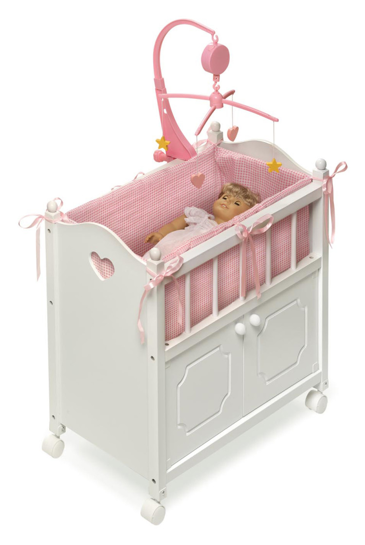 Badger Basket’s top-of-the-line Cabinet Doll Crib with Bedding, Mobile, and Wheels welcomes your special dolly at bedtime and includes a nice sized storage cabinet to keep doll clothes and accessories organized for the day! Personalize with pretty shapes and your child’s name (or favorite doll’s name) using the free, self-adhesive decals included! This remarkable doll crib is sure to be the focal point of many make-believe parenting adventures for your gentle, loving child. Frilly ribbons, spindles, round bed knobs, and heart cutouts add a complimentary touch to the soft, fabric bedding. Bedding set includes liner fully covering the inside of the crib, a blanket, and a stuffed pillow. Real, working musical mobile winds up and slowly rotates to soothe your baby doll into dreamland. Interesting shapes dangle from the mobile to add a realistic look. Mobile plays a happy nursery or lullaby tune (tunes vary) and does not require batteries. Mobile attaches to either side of the crib, or detaches if you do not want to use it. The two cabinet doors with knobs open to reveal ample storage room for your doll clothes and accessories. Concealed magnets hold the doors closed. Fully enclosed cabinet keeps your stuff contained and nothing falls out the back or sides. Taller crib design is comfortable for children of all ages to play with. Smooth rolling casters allow the doll crib to move from room to room for play dates. For dolls up to 22-inches. Fits 18-inch dolls such as American Girl, My Life As, Madame Alexander, Ashton Drake, and Our Generation; and fits 15-inch American Girl Bitty Baby dolls and 14.5-inch American Girl WellieWishers dolls. Doll Crib is made of wood and engineered wood. Bedding made with 100% Polyester fabric with 100% Polyester fill. Mobile is plastic. Alphabet/shape decals made with laminated, waterproof PVC. Overall assembled dimensions 24 inches L x 12.25 inches W x 24 inches H. Mobile adds another 16 inches to the height. Top of crib rail to floor: 21.75 inches H. Interior of crib: 22.5 inches L x 10.25 inches W x 7.25 inches H. Cabinet: 22.5 inches L x 10 inches W x 10.5 inches H. Blanket: 19.5 inches L x 9.5 inches W. Pillow: 7 inches L x 4.5 inches W. Decals: 1-1.25 inches H. Assembled weight: 13.8 pounds. All measurements approximate. Spot clean or hand wash the fabric bedding with cold water and mild detergent as needed and air dry. Wipe the frame clean as needed with a lightly dampened cloth and dry thoroughly. Do not use chemical cleaners on the peel-and-stick decals. Adult assembly required. Illustrated instructions included for crib assembly and application of the decals. For children from three years old and up. This toy is for dolls only and is not for use with real infants or pets. /! WARNING: CHOKING HAZARD – Small parts. Not for children under 3 yrs. Product complies with all currently applicable safety standards. Product includes a limited warranty of 30 Days Parts to the original purchaser. Doll and doll clothes/accessories not included. Product may vary slightly from shown and described. Props/accessories shown are for illustration purposes only and are not included with the product. Actual color/finish may vary slightly from screen display. This item ships in its original carton that may include a product photo.