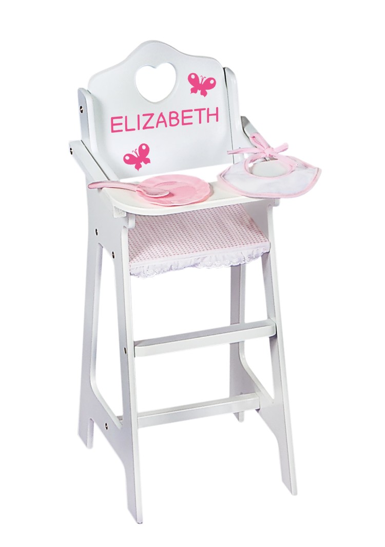 - Classic doll high chair comes with a plate, bib, and spoon and a free personalization kit to add your child’s name