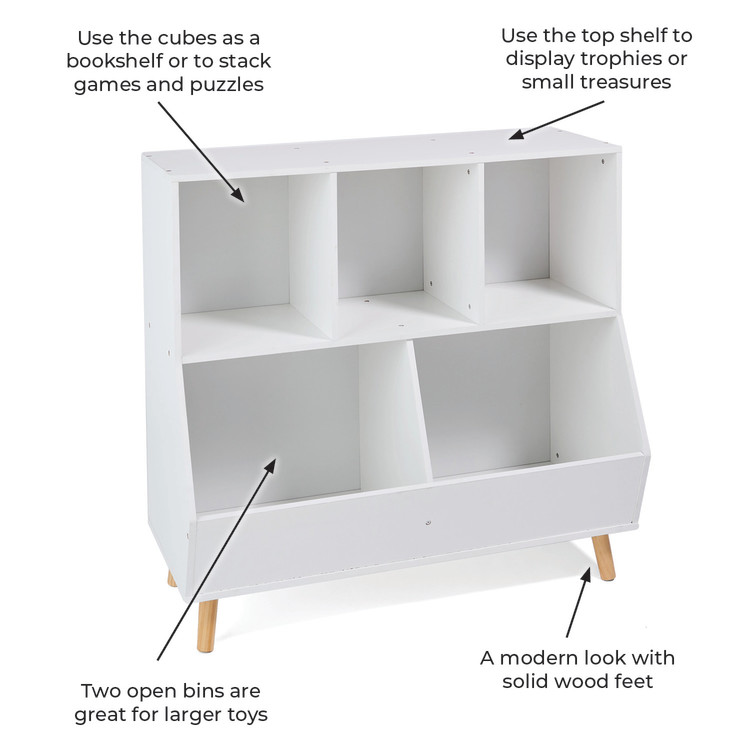 The Badger Basket Storage Organizer is a convenient all-in-one storage unit that makes clean up fun and easy for kids. This spacious organizer includes five handy storage bins and will help you keep your living room or playroom tidy, clutter free, and looking great! It features two large open-mouth bins that are perfect for larger toys like stuffed animals, dolls or trucks. It also has three square cubbies for books, puzzles and other toys your child can easily access. The modern look features four sturdy wooden feet to keep it off the floor so your child can see all of their toys without struggling to reach them. Made with a smooth and easy-to-clean melamine surface, the toy storage station will withstand years of play. Overall dimensions 35.5″L x 15.75″W x 33.5″H. Two large bins measure 17″L x 14.5″W x 16.75″H. Three square bins measure 11.75″L x 11.5″W x 11.25″H. Assembled weight is 36.5 lbs. All measurements approximate. Wipe clean with a lightly dampened cloth and mild detergent as needed and dry thoroughly. Adult assembly required. Illustrated assembly instructions included. Non-toxic finish. Product complies with all currently applicable safety standards and CARB ATCM standards. Product may vary slightly from shown and described. Props/accessories shown are for illustration purposes only and are not included with the product. Actual color/finish may vary slightly from screen display. This item ships in its original carton that may include a product photo.