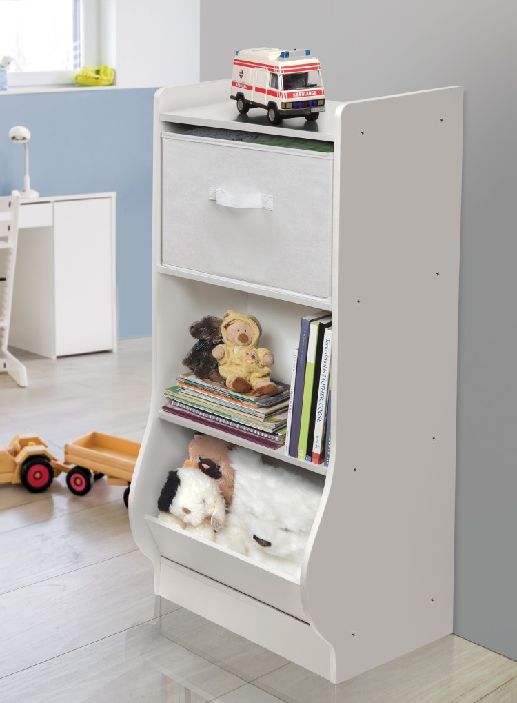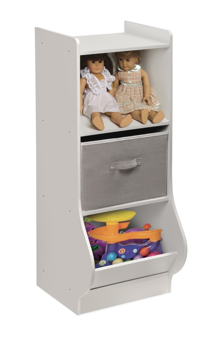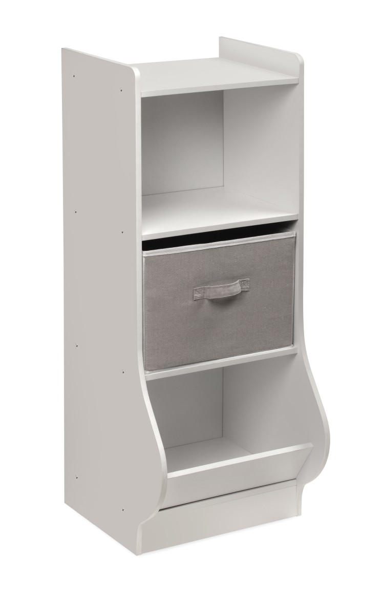 Badger Basket’s Upright Storage Nook is perfect for organizing small spaces. With a small footprint measuring only 12 inches long x 15.25 inches wide, it allows for maximum storage in minimum space. Perfect for storing small toys, books, stuffed animals, and puzzles; the Upright Storage Nook is ideal for kid’s rooms, playrooms, and even family rooms. Have more space? No problem. Line up 2 or 3 Storage Nooks together to create a custom storage solution that is perfect for your family. Includes one removable and reversible storage basket, two shelves, and one angled bin. Solid panel construction ensures that your treasured items stay inside the unit – nothing falls out the back or sides. Smooth surfaces are easy to clean and maintain. Made with laminated wood, melamine finish and metal hardware. Basket made with non-woven fabric and has internal cardboard support panels. Overall dimensions are 15.5 inches wide x 15.75 inches deep x 37.75 inches high (12 inches deep at the bottom). Shelf areas each: 14.25 inches wide x 10.5 inches deep x 11.25 inches high. Basket: 13.75 inches wide x 11 inches deep x 9.75 inches high. Bottom bin – interior width and height: 14.25 inches wide x 13 inches deep (15 inches deep at top of angled ledge) x 11 inches high. Bottom bin opening measures 14 inches wide by 7 inches high. Assembled weight is 25 pounds. All measurements approximate. Wipe clean with a lightly dampened cloth and mild detergent as needed and dry thoroughly. Spot clean the baskets as needed with cold water and mild detergent and allow to air dry (never immerse in water). Adult assembly required. Illustrated assembly instructions included. Non-toxic. Product complies with all currently applicable safety standards and CARB ATCM standards. Product may vary slightly from shown and described. Props/accessories shown are for illustration purposes only and are not included with the product. Actual color/finish may vary slightly from screen display. This item ships in its original carton that may include a product photo.