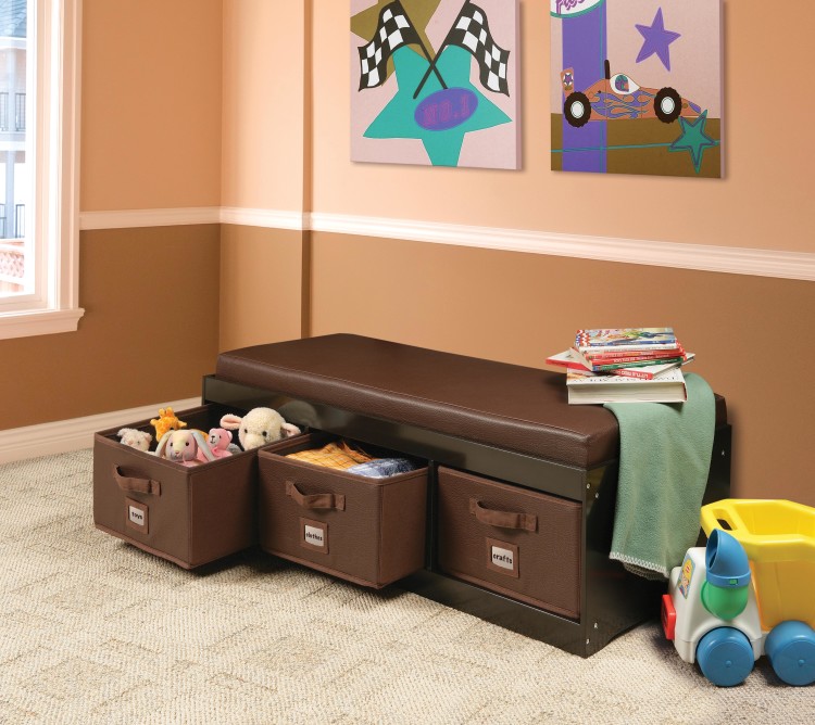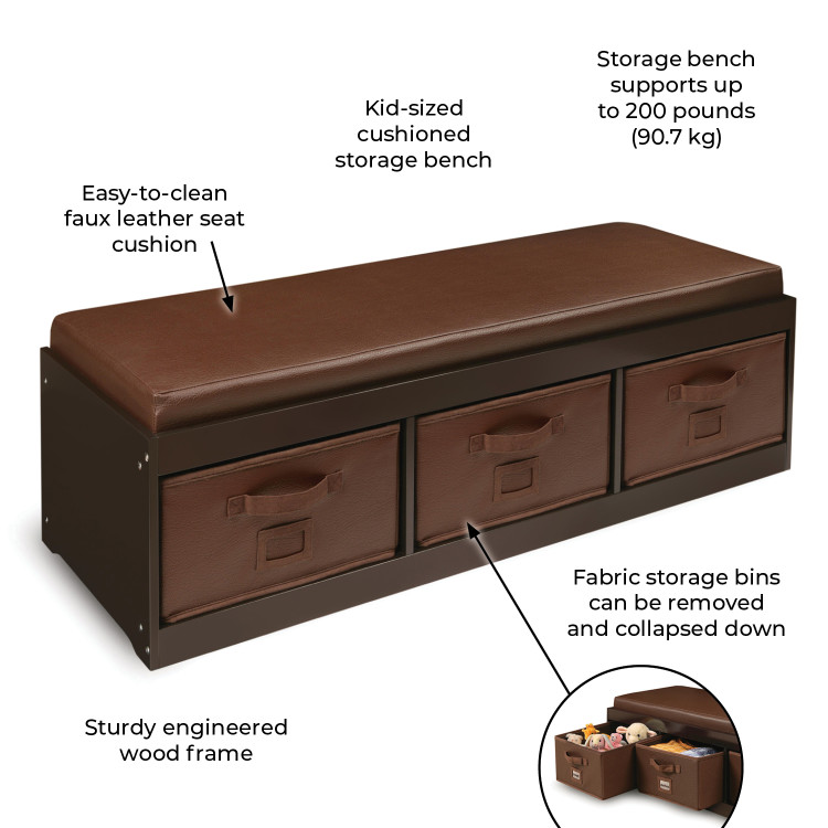Kid’s Storage Bench with Cushion and Three Bins – Espresso