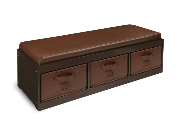 - A classy, durable and comfortable bench with storage bins below and a faux leather covering on the cushion for easy cleanup.