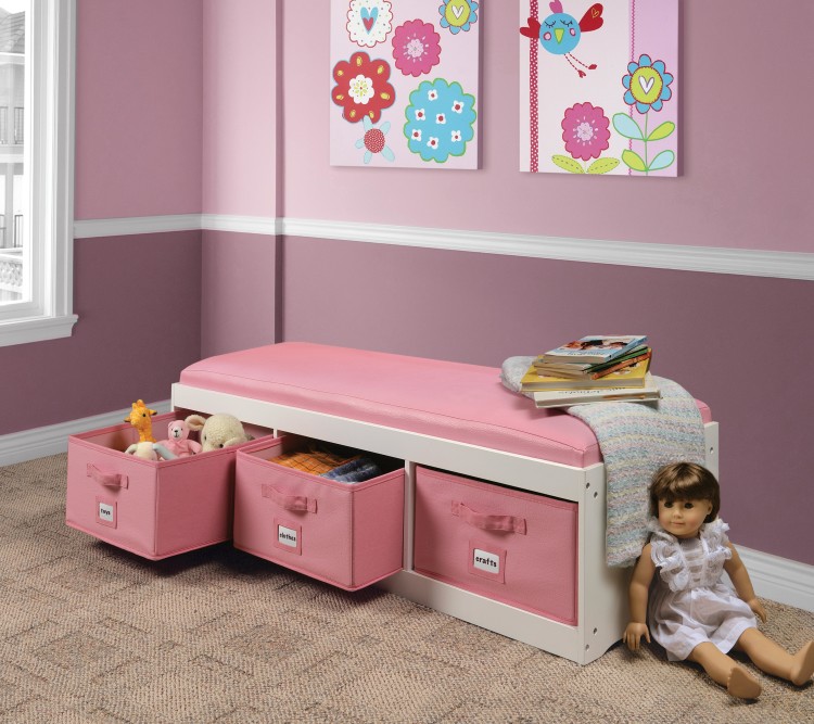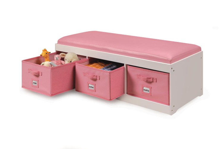 Kid’s Storage Bench with Cushion and Three Bins – White with Pink