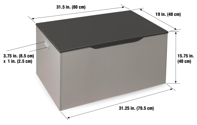 Badger Basket’s oversized Flat Bench Top Toy and Storage Box brings order to a large assortment of toys, or blankets and towels in a guest room, or use it to control frustrating clutter wherever it gathers around the house. Simple, functional design, with clean lines, sits quietly in any living area, such as bedrooms and playrooms. Bench top is great for children as a reading seat, time out spot, or handy place for kids to sit down for putting on shoes. Visiting guests will appreciate it as a surface to support their suitcase. Children will learn how easy it is to clean up and keep their special things in one, orderly place. Quality hardware with two safety support hinges that hold the lid open, preventing slamming, finger crushing, or pinching. Reinforced side handles make it easy to move around when vacuuming or rearranging furniture. Handle opening on the front under the lid is a convenient way to lift up the top, and prevent injury when shutting it. Smooth surfaces are easy to clean and maintain. Lid opens to full vertical allowing easy access to the impressive 4.5 cubic feet of space inside. Made of engineered wood with anti-scratch, melamine lamination. Bottom board has paper lamination. Metal hardware. Overall measurements 31.5 inches L x 19 inches W x 15.75 inches H (34 inches H with lid fully open). Interior space dimensions: 30.5 inches L x 17.75 inches W x 14.5 inches H. Handle openings are 3.75 inches W x 1 inch H. Assembled weight: 29.7 pounds. All measurements approximate. Wipe clean with a lightly dampened cloth and mild detergent as needed and dry thoroughly. Do not use acidic cleaners (such as vinegar). Adult assembly required. Illustrated assembly instructions included. Product complies with all currently applicable safety and composite wood standards. Bench can support up to 175 pounds. Product includes a 30 Day Limited Manufacturer’s Warranty. Product may vary slightly from shown and described. Props/accessories shown are for illustration purposes only and are not included with the product. Actual color/finish may vary slightly from screen display. This item ships in its original carton that may include a product photo. Some soft plastic/rubber toys (such as balls) can react with and cause damage to the finish when left in prolonged contact. Be mindful of what is stored in the unit and regularly check toys and the unit to prevent damage.